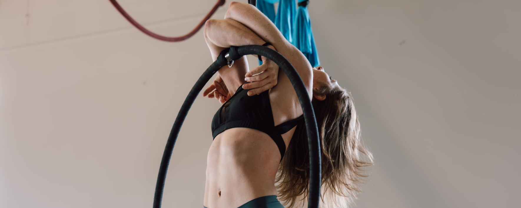 Aerial Hoop gehört wie Aerial Silk und Trapez zur Gruppe Luftakrobatik. Du bewegst Dich elegant in einem von der Decke herabhängenden Luftring aus Stahl. Wenn Du schon einmal im Zirkus warst, kennst du den Ring ganz bestimmt.